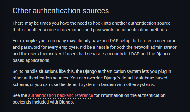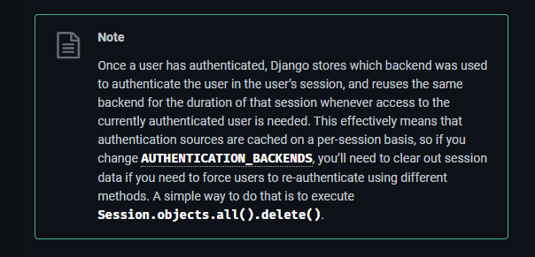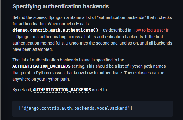 사용자가 인증되었다면, Django는 사용자 세션에서 사용자 인증에 사용된 백엔드를 저장.