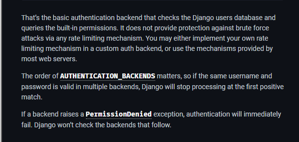 django.contrib.auth.authenticate()를 호출하면 Django는 모든 백엔드 인증을 거친다.