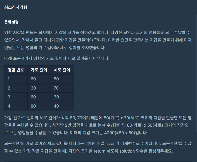 # 1. 각각의 원소별로 sort하고, for문으로 sizes를 돌면서 큰값을 찾는 방법