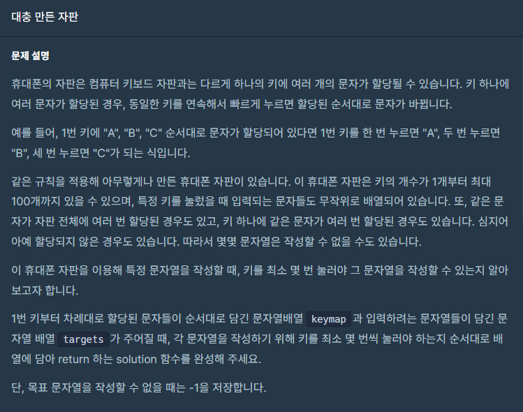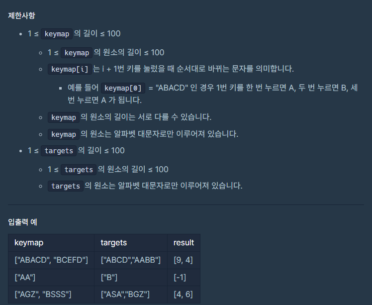 if 글자 not in 최소누르는횟수: # 눌러도 입력할 수 없다면 바로 -1을 넣고 break