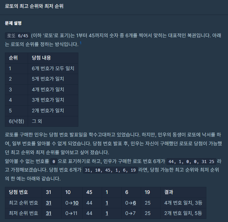 len(lottos)+1로 최저 등수, 거기서 lottos의 원소들 중 0의 개수를 더 빼주면 최고 등수가 된다.