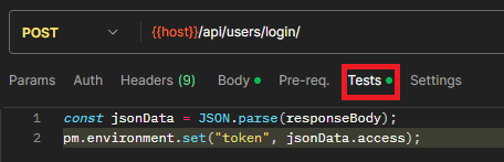 access 토큰이 발급되는 요청의 Tests 탭으로 이동.