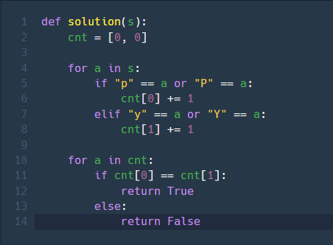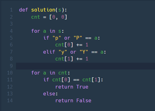 문자열을 for문으로 하나씩 돌면서, 빼온 친구가 p나 y면(or) 각각의 카운트를 증가시키게 만들었다.
