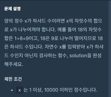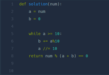 숫자 자릿수별로 떼서 합한 값으로 원래 수를 나눴을 때 나머지가 0이 되는지 검사하는 함수