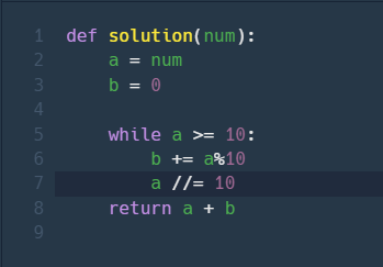 양의 정수 num을 a에 넣고, 10보다 클 때, 10으로 나눠주면서 재귀함수?를 만들어 a의 값이 10이하인 동안 반복되도록 만들었고, 몫은 b에서 합치고 마지막 10보다 작은 a는 1의자릿수가 된다. 그 둘을 합쳐서 해결.
