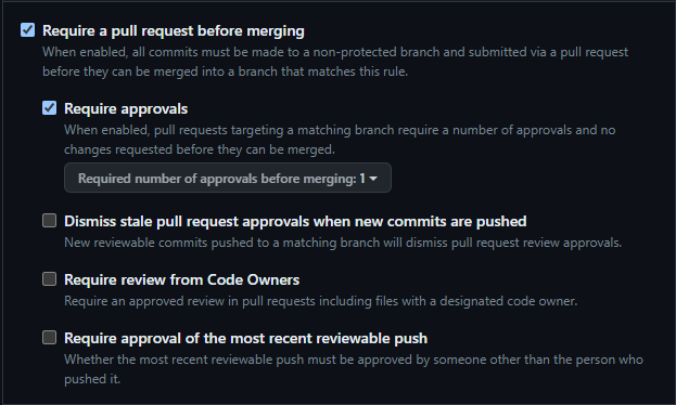 | Require a pull request before merging | merge 전에 pull request를 강제하는 옵션 대상 브랜치에 대한 모든 변경 사항이 일반적인 push가 아니라 PR을 통해 이루어져야함. 세부적으로 코드 리뷰가 필요한지, 몇명의 리뷰가 있어야 하는지 등을 설정 가능 |