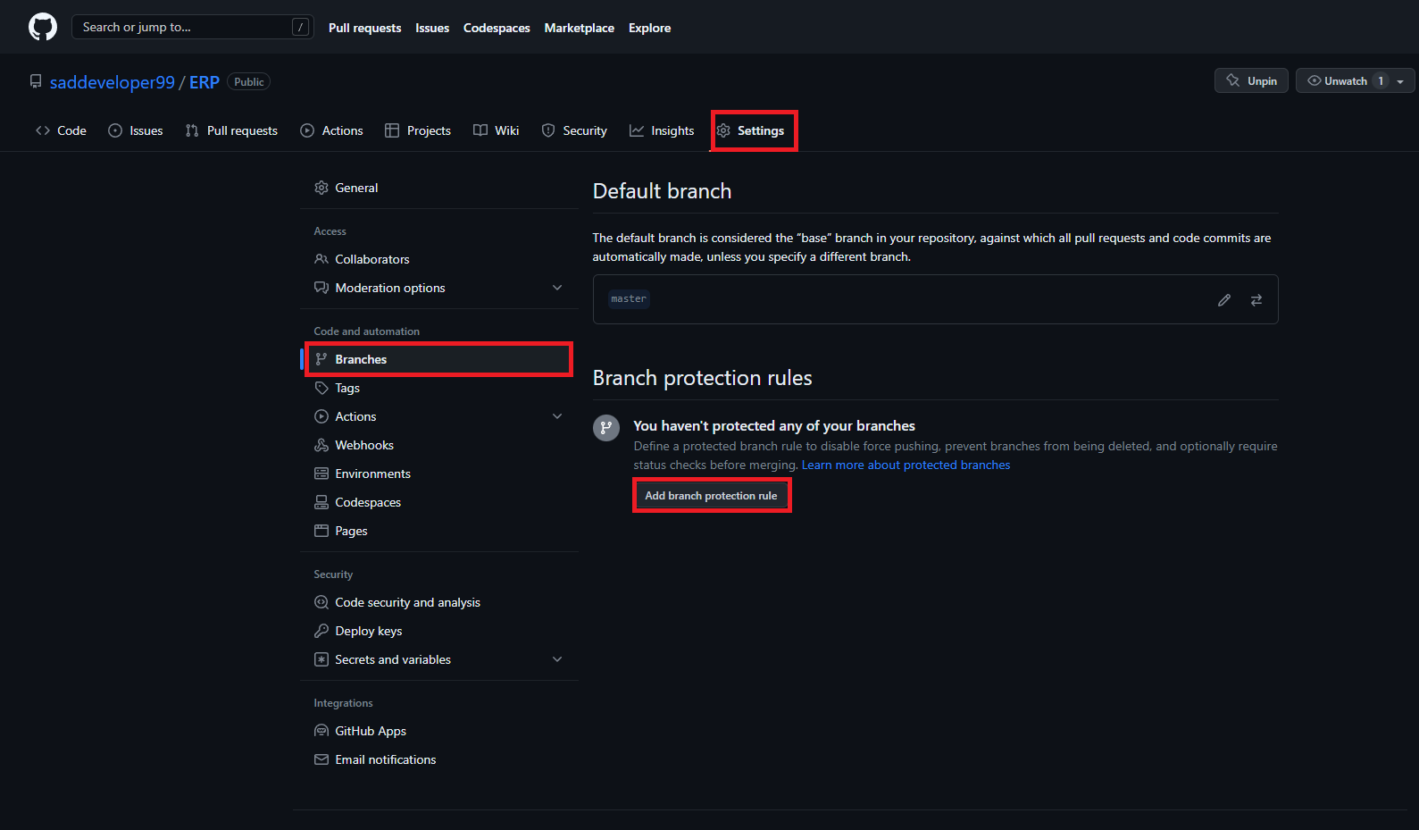 Repository - Settings - Branches - Add branch protection rule
