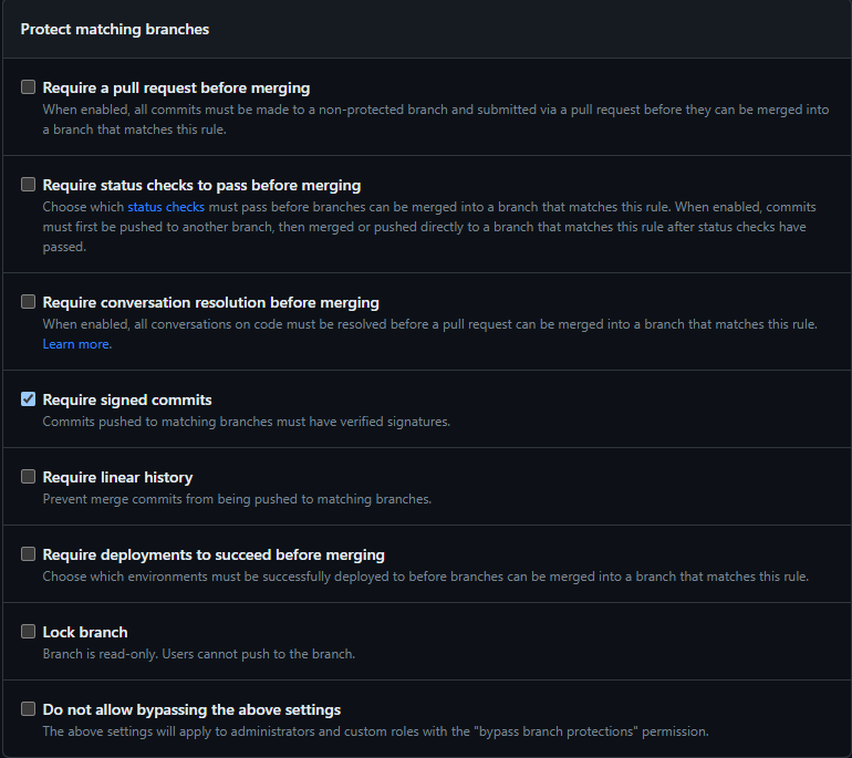 | Require signed commits | 서명된 커밋만 푸시 가능. 믿을 수 있는 출처에서 생산된 커밋들(verify 마크가 찍혀있다.)만 푸시할 수 있다. 서명된 커밋에 대한 정보 |