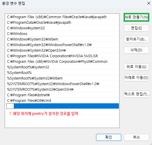 (3) 새로 만들기 클릭 후, 1번에서 복사한 경로 입력